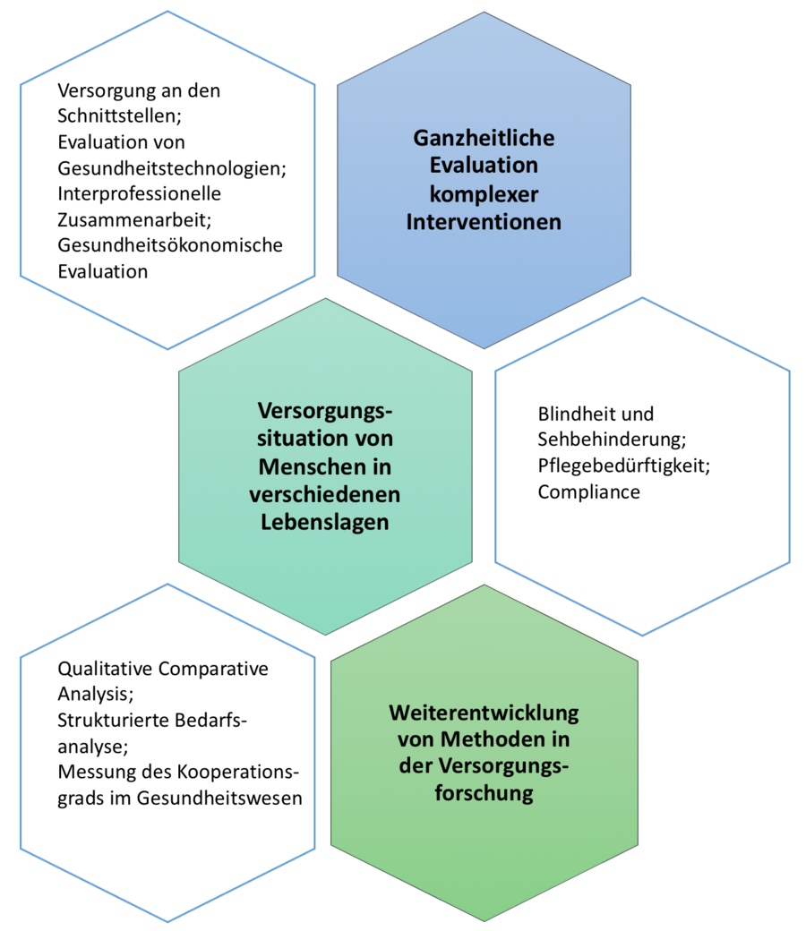 Des Weiteren beschäftigen wir uns mit der Versorgungssituation von Menschen in unterschiedlichen Lebenslagen (z.B. bei Pflegebedürftigkeit) und in verschiedenen Indikationsgebieten (z.B. der Ophthalmologie). In diesem Zusammenhang gilt unser Interesse auch der Erhebung von Versorgungspfaden sowie den Auswirkungen gesundheitspolitischer Entscheidungen auf das Versorgungsgeschehen und den Bürger.